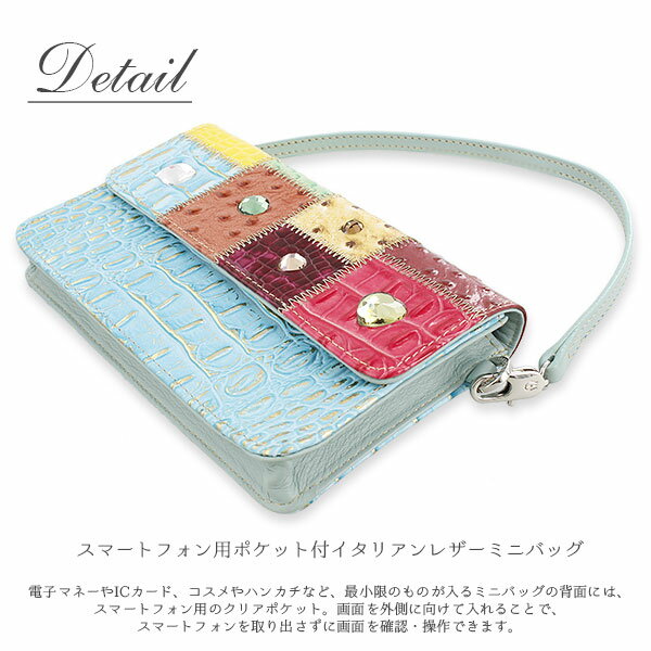【MICHELANGELO】スマートフォン用ポケット付イタリアンレザーミニバッグ 電子マネーやICカード、コスメやハンカチなど、最小限のものが入るミニバッグの背面には、スマートフォン用のクリアポケット。