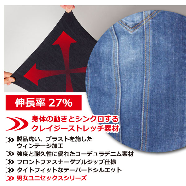 ◇特 長◇ ・身体の動きとシンクロする クレイジーストレッチ素材(伸長率 27%) ・製品洗い、ブラストを施したヴィンテージ加工 ・強度と耐久性に優れたコーデュラデニム素材 ・フロントファスナーダブルジップ仕様 ・タイトフィットなテーパードシルエット ・男女ユニセックスシリーズ(Sサイズのみ) ◇仕 様◇ ・レベルブック収納ポケット(右・深さ21cm) ・胸ペン差し(左) ・袖ペンポケット(左) ・内ポケット(左) ・ダブルジップ仕様 ◇素 材◇ コーデュラストレッチデニム 混率:綿65%、ポリエステル19%、 ナイロン14%、ポリウレタン2% ※伸長率27%、製品洗い、ブラスト加工 ◇カラー◇ (45)インディゴ ◇サイズ◇ S・M・L・LL・3L/【別価格】4L ※サイズ詳細は画像をご確認ください